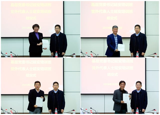 在培训班结业式上,校党委书记王树权听取学员学习汇报并讲话,同时为学员们颁发结业证书。
