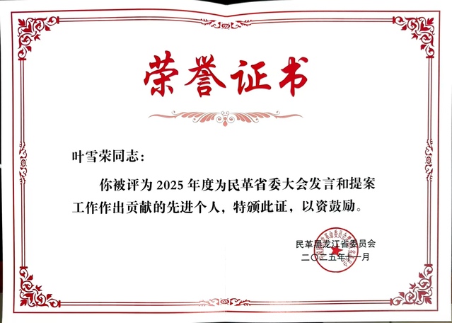 会议对为民革省委参政议政工作作出突出贡献的集体和个人进行了表彰。共表彰了2025年度为民革省委参政议政工作作出突出贡献的2个先进集体和2名先进个人,为民革省委大会发言和集体提案工作作出贡献的10个先进集体和11名先进个人,以及为民革省委反映社情民意信息工作作出贡献的13个先进集体和15名先进个人。其中,民革哈尔滨工业大学委员会第二支部获评2025年度为民革省委大会发言和提案工作作出贡献的先进集体,民革党员叶雪荣获评2025年度为民革省委大会发言和提案工作作出贡献的先进个人。